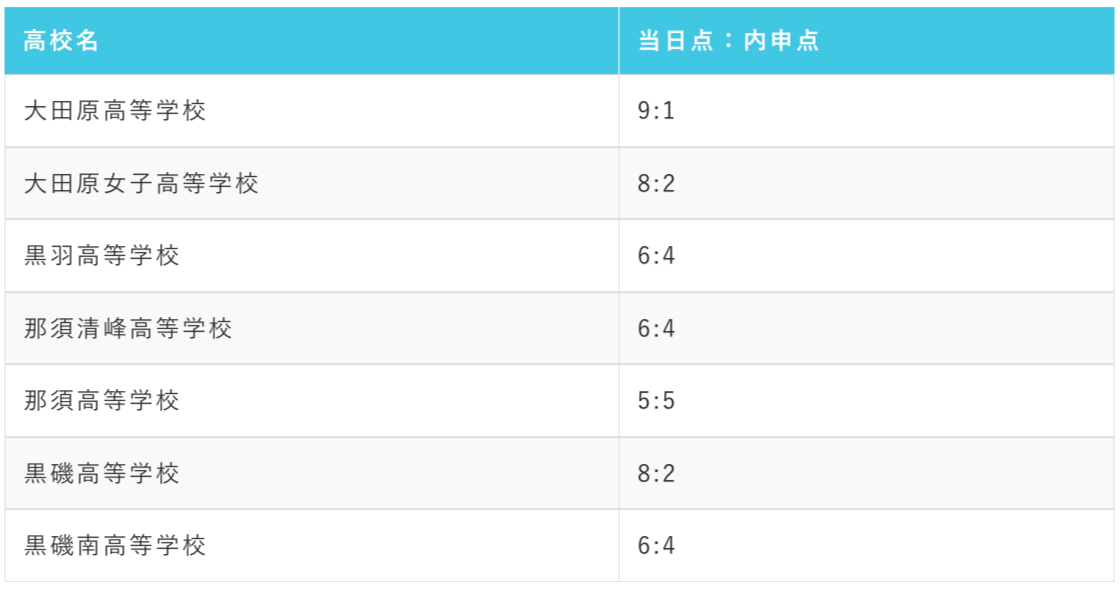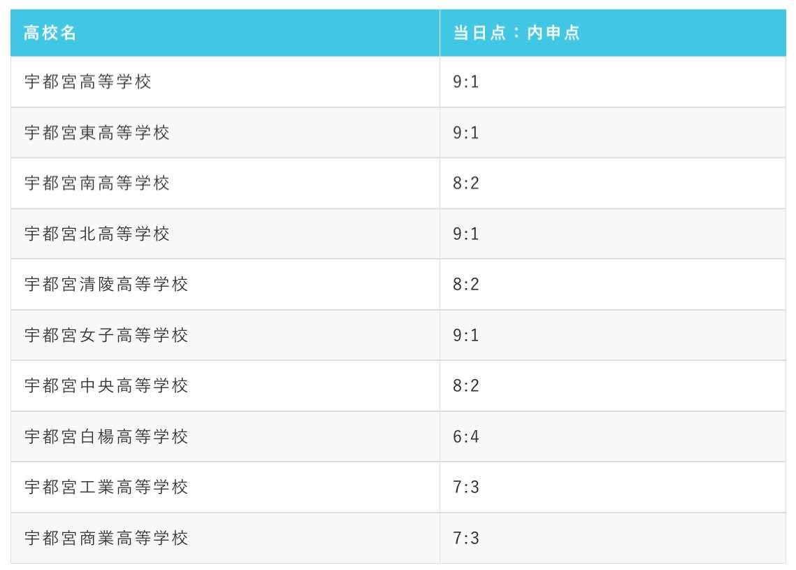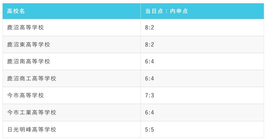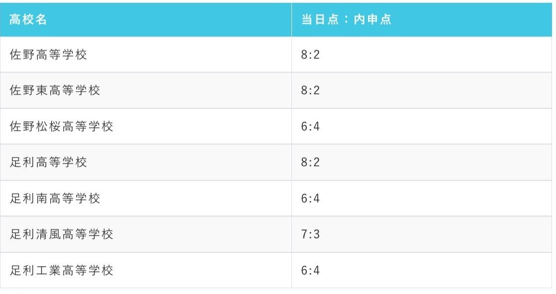 栃木県内の公立高校一般入試の場合、内申点が合否に影響を与える割合は学校によって異なります。以下は栃木県内の公立高校と、合否判定における入試の点数と調査書の点数の割合を示したものです。なお、高校の数の関係上、旧学区に分けて全日制のみ記載しています。