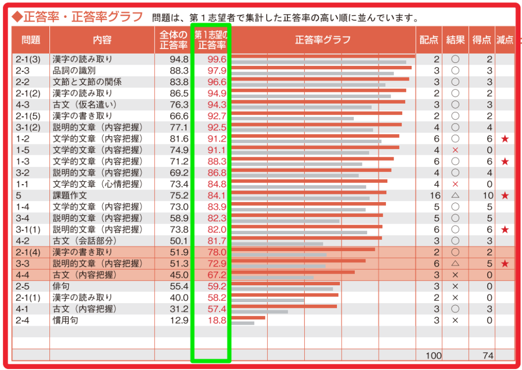 ☑「11:正答率」を見ると、受験生全体の正答率と、第1志望校が同じ人の正答率が小門ごとに表示されています。第1志望校が同じ人の正答率の高い順に並んでいるのが特徴です。