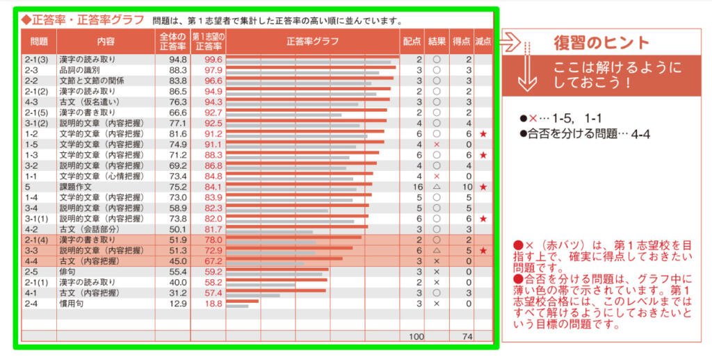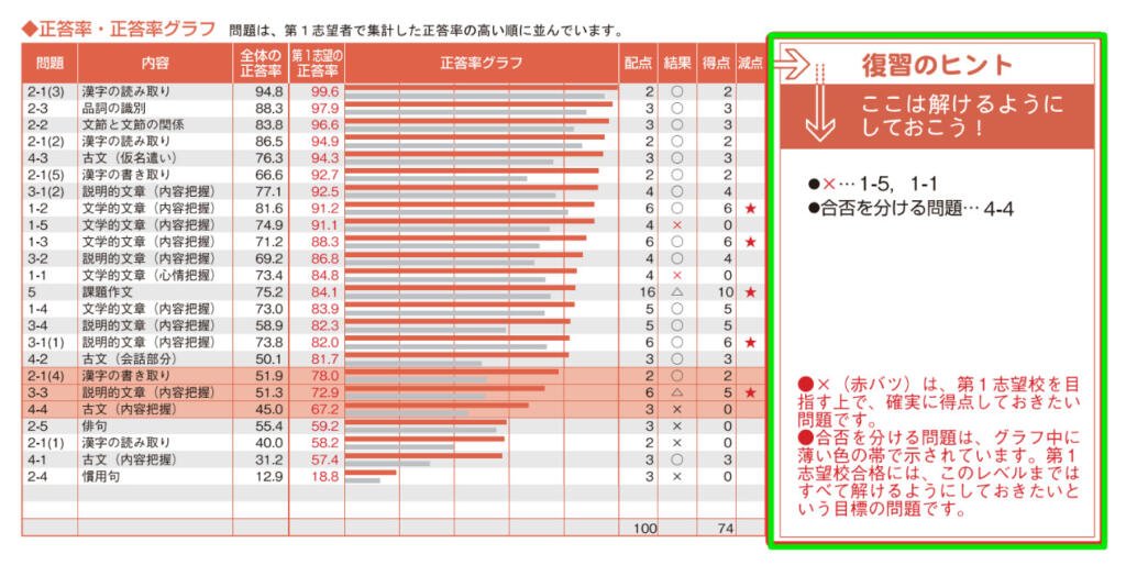 ☑合否を分ける問題 ― 「合否を分ける問題」は正答率グラフの表の中に、カラーのラインで示しています。この得点ラインまでの問題がすべて解けるかが第1志望校合格の目安となります。
