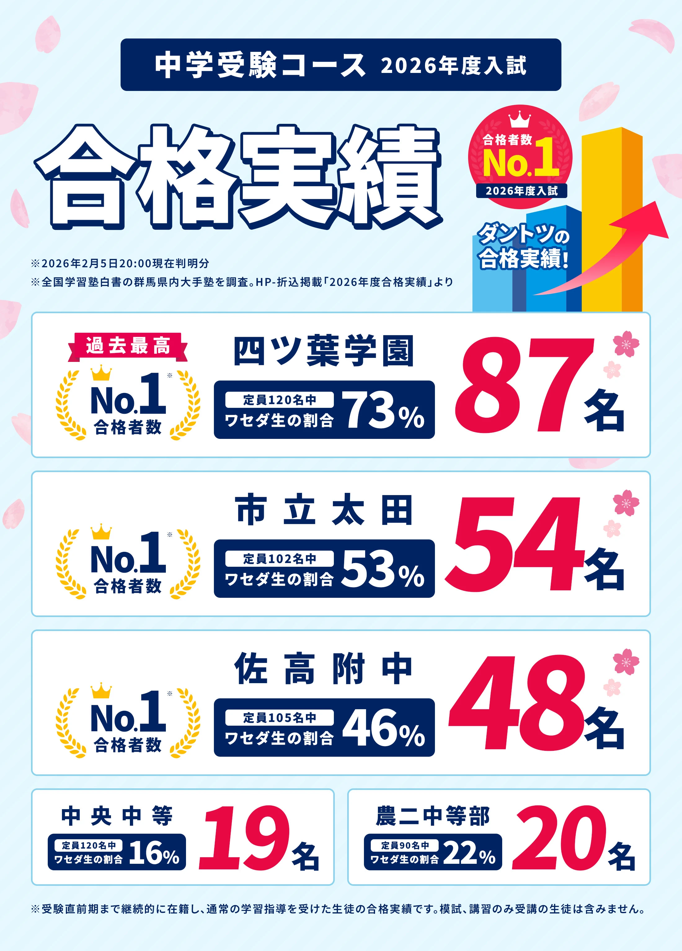 各志望校の合格ボーダーラインはその年によって違います。ワセダではスケールメリットを最大限に活用して、いち早く情報をキャッチし事前にボーダーラインを把握します。その結果、教師のたゆまぬ努力が実を結び、偏差値50で難関校合格という奇跡が誕生するのです。