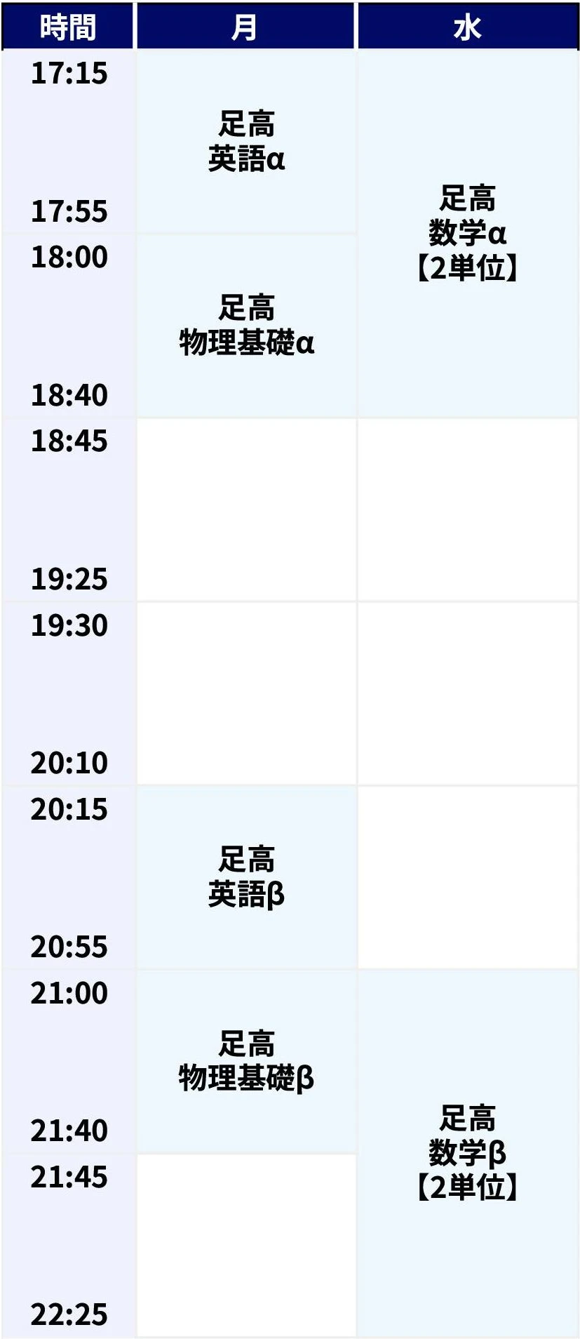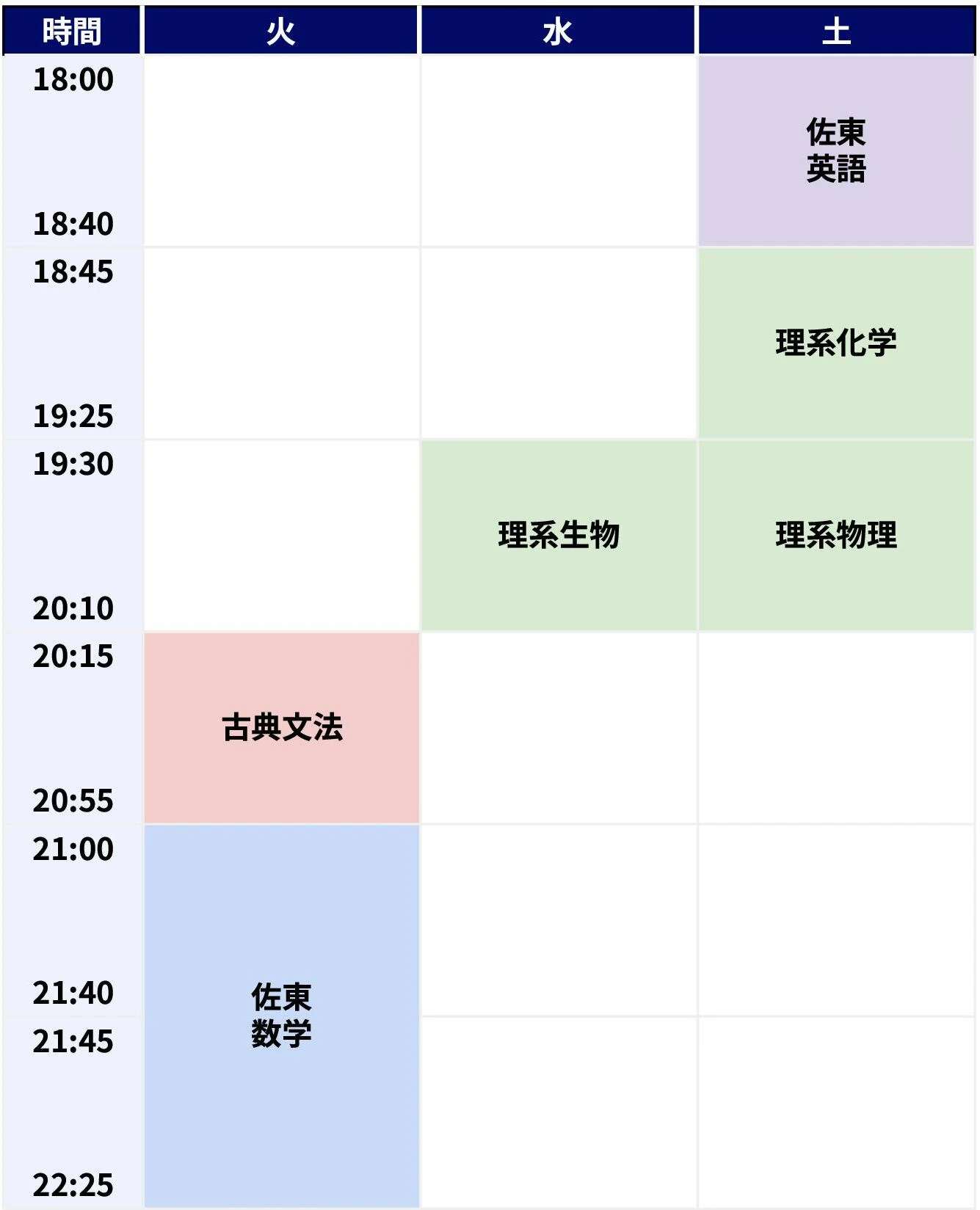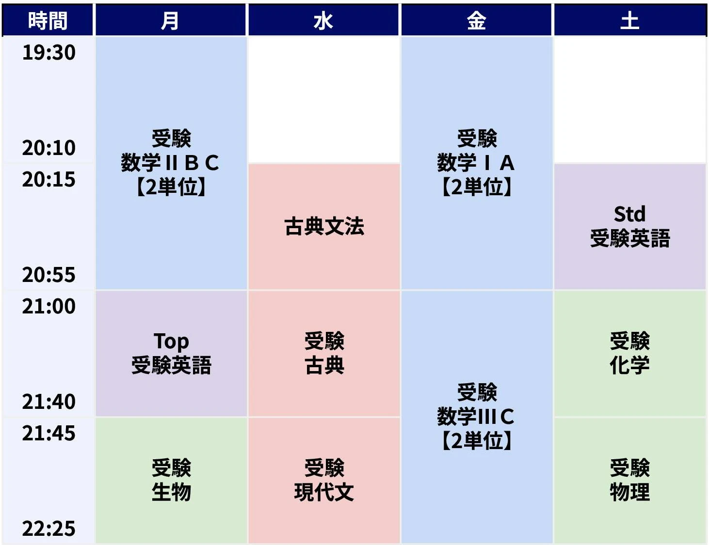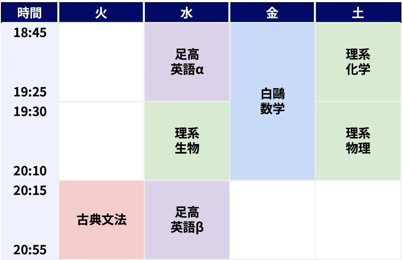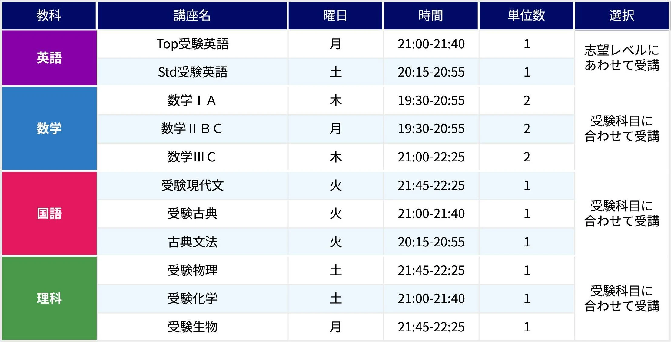 高3:英語文法・英語読解・数学ⅠA・数学ⅡB・数学Ⅲ・現代文・古文・漢文・物理・化学・生物・生物基礎